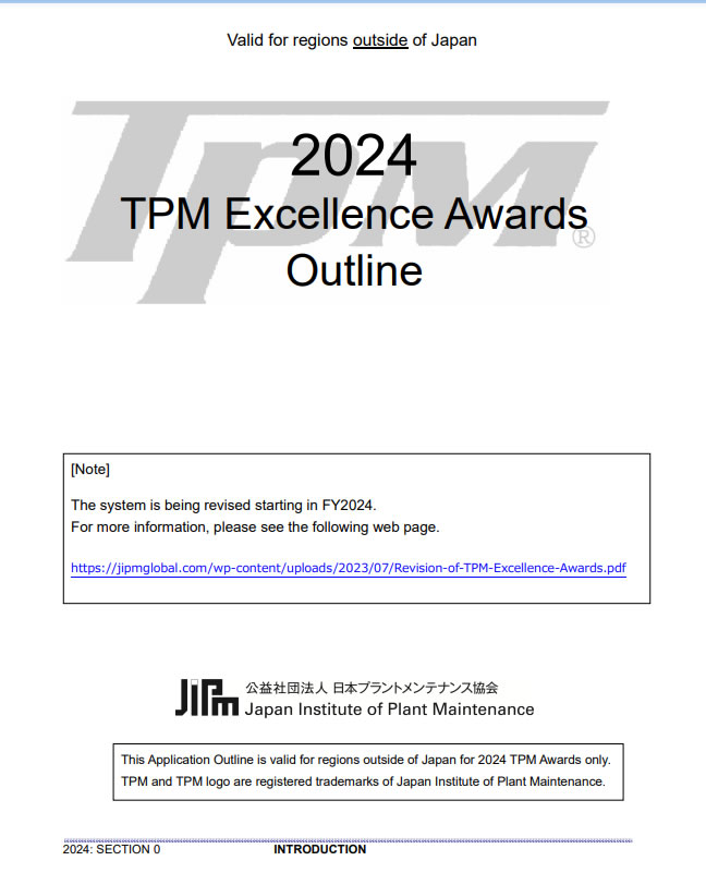 El Instituto Japonés de Mantenimiento de Plantas (JIPM) ha publicado la convocatoria para el Premio Excelencia en TPM para este año. En este documento podrás conocer los requisitos de las cinco categorías del premio. Si tu empresa no está interesada en aplicar, este documento es muy útil como guía para el desarrollo de un proyecto TPM, siguiendo el enfoque JIPM.